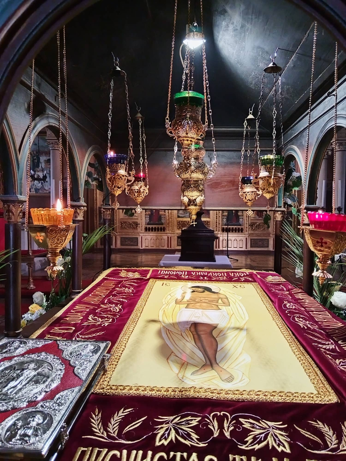 U poslijepodnevnim satima se služi Večernja Velikoga petka s polaganjem plaštanice u Božji grob postavljen nasred crkve. Crkva tada postaje simbolički Božjim grobom. Plaštanica je svečano platno na kojem se nalazi ikona ili slika mrtvoga Krista koja se svečano iznosi iz oltara nasred crkve uz pjevanje stihova: “Kada te Arimatejac mrtvoga s križa skinuo, Živote sviju, mirom te pomaza i plaštanicom umota; potaknut ljubavlju, srcem i usnama cjelivaše tvoje bezgrješno tijelo. Premda u strahu, radosno ti je kliktao: Slava poniženju tvojem, Čovjekoljupče! I Adam sa zahvalnom radošću zapjeva: Slava poniženju tvome, Čovjekoljupče!” Ponekad se s plaštanicom drži procesija po crkvi ili izvan nje. Služba završava pred grobom pjevajući tropar: ”Ugledni Josip skine s drveta prečisto tijelo tvoje, i pomazavši ga miomirisima omota čistim platnom te u novi grob položi”. Grob je okićen cvijećem, a plaštanica posuta cvjetnim laticama koje vjernici uzimaju prigodom dolaska Božjem grobu na poklon. Pred Božjim grobom klanja se s tzv. metanijom – velikim poklonom u kojem se čelom dotiče tlo.