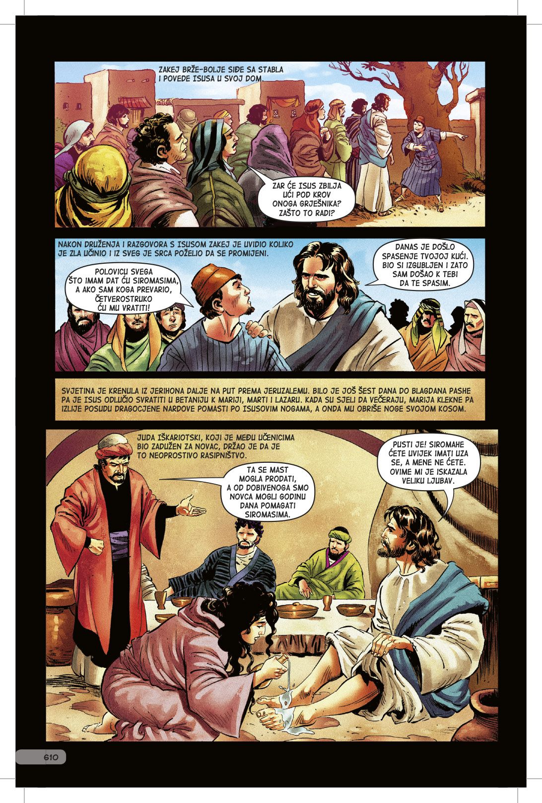 BIBLIJA NA DRUGAČIJI NAČIN FOTO Recenzija Velike Biblije u stripu: Djelo visoke kvalitete i dosljedna interpretacija temeljne knjige kršćanstva "Velika Biblija u stripu skladno uklapa u dugu tradiciju slikovno-narativnih adaptacija Biblije, a njezin je kreativni i tržišni uspjeh tim veći zbog toga što je riječ o izvrsnome djelu. Autori demonstriraju svoj izravan odnos prema predlošku, prema kojem osjećaju poštovanje i divljenje, ali i sasvim nenametljivo u rekonstrukciji i interpretaciji ostavljaju prostora za osoban stav i umjetnički izričaj." Tomislav Čegir Podijeli: Raskošno izdanje nakladnika Verbum Velika Biblija u stripu izvorno je objavljeno u SAD-u 2010. godine pod naslovom The Action Bible, a autori su mu scenarist i urednik Doug Mauss te crtač Sergio Cariello. Amerikanac Mauss po zanimanju je pastor, dok je Cariello (1964) u Sjedinjene Države došao iz Brazila prije gotovo tri desetljeća. Stripovska adaptacija Biblije s više od 750 stranica u cjelovitom je izdanju prevedena na tridesetak jezika i objavljena u više od trideset država, dok je samostalno izdanje dijela Novoga zavjeta, s naslovom Priča o Isusu, još raširenije i uspješnije, s prijevodom na pedeset jezika, distribuirano u gotovo stotinu država i ostvarilo više milijuna prodanih primjeraka. Autori nisu krili da im je kao izvorno nadahnuće poslužio ne samo kršćanski biblijski izvornik, nego i The Picture Bible iz 1978. godine, sa scenarijem Ive Hoth i crtežom André LeBlanca, opsežno djelo s više od osam stotina stranica. Obje adaptacije Biblije povezuje nakladnik David C. Cook pa su njihove veze itekako višeslojne. Zanimljivo je da su u proteklih nekoliko desetljeća nastala još neka stripaška posezanja za Biblijom. Nekoliko godina nakon Hothova i LeBlancova djela 1983., scenarist Claude Moliterni i crtač Jesus Blasco objavili su u Francuskoj i Italiji Bibliju u stripu. Ostvarenje je to od 176 stranica, realističkoga crteža i u boji. Zatim je Amerikanac Chester Brown adaptirao Evanđelje po Marku (1987–1989), dok je Evanđelje po Mateju (1989–1997) ostalo nedovršeno, a Manga Biblija: Od Postanka do Otkrivenja (2007) Ayinbaya i Akina Akinsikua na slobodan način interpretira kršćanski izvornik i preklapa ga s japanskim utjecajima i kulturom. Rad Chestera Browna nedvojbeno pripada američkome nezavisnome stripu, ostvaren je u crno-bijeloj tehnici, a kvalitetu mu potvrđuje i čitateljstvo kao i kritika. S druge strane Ayinbayo Akinskiku, poznat pod pseudonimom Siku je englesko- nigerijski autor, pa njegova također crno-bijela izvedba u 200 stranica odražava prožimanje japanske mange i britanskoga neovisnoga stripa. Nema sumnje da je iznimna i grafička novela Sin čovječji (1995) danskoga autora Petera Madsena. Rađen u akvarelu, taj strip od 136 stranica, plod je trogodišnjega kvalitetnoga rada i istraživanja te ne čudi da je u Danskoj postao vrlo popularan. Međutim, ni hrvatsko izdanje Velike Biblije u stripu nije i prva takva u nas prilagodba temeljne knjige kršćanstva. Godinu nakon prvotnoga izdanja nakladnik Duhovna stvarnost preveo je LeBlancovo djelo pod naslovom Biblija u stripu. Još je godine 1981. Kršćanska sadašnjost započela s objavljivanjem izvorno francuske strip-adaptacije Biblije scenarista Pierre Thivolliera i Xaviera Musquere kao crtača Staroga zavjeta te Pierre Brocharda kao crtača Novoga, a nakon četrdeset svezaka tiskanje je dovršeno pet godina poslije. Zanimljiva narativnoga prosedea, ta je prilagodba upotpunjena i nizom kratkih povijesno-teoloških tekstova. Verbumovo izdanje Biblija u stripu iz 2014. scenarista Tonija Matasa i crtača Picanyola prevedeno je sa španjolskoga jezika i namijenjeno je mladom čitateljstvu. A da sprega bude potpuna, hrvatski je crtač Dalibor Talajić sudjelovao u nastanku jednoga od niza francuskih novozavjetnih prilagodbi, izvrsnoga Evanđelja po Mateju objavljena 2009. godine. O Bibliji u stripu Hotha i Le Blanca Već je navedeno da su poveznice Biblije u stripu Ive Hotha i André LeBlanca te Velike Biblije u stripu Douga Maussa i Sergija Cariella jasne. Podjednako je tako razvidno da su autori i jedne i druge prilagodbe vjernici, ali im odnos prema građi stripa nije dogmatski, već u skladu s jezikom devete umjetnosti. Isti nakladnik, David C. Cook, kao i crpljenje izvornoga nadahnuća Maussa i Cariella ne samo iz biblijskoga teksta, nego i iz strip adaptacije Hotha i LeBlanca povod su kratkoga osvrta na stariji strip, njegove značajke, usporedbu dvaju prilagodbi čije nastanke dijeli tridesetak godina. Biblija u stripu je nesumnjivo značajno djelo. Kvaliteta i utjecaj joj nisu jenjali nakon prvoga cjelovitoga izdanja. Tiskana je u više navrata i tijekom 1980-ih i tijekom 1990-ih, rado je čitana i u Sjedinjenim Državama, kao i u drugim državama pa tako i u Hrvatskoj. Takvoj popularnosti ponajviše duguje ne samo aktivnome nakladniku, nego još više i autorima. Tako je Hoth (rođen 1911.) scenarist precizan u rekonstrukciji biblijskoga predteksta. Ne pretjeruje u preuzimanju da ne bi postao redundantan, odabir mu je prijemčiv pri prenošenju u jezik stripa te predočava srž pripovijesti, ali ih i nadograđuje vlastitim narativnim pristupom. Premda André LeBlanc (1921-1998.) nije u nas među najpoznatijim strip crtačima, njegova je karijera ipak itekako zavidna. Još je od 1940-ih do 1960-ih surađivao u poznatim strip serijalima, bilo da je riječ o novinskom stripu, bilo o strip-svescima. Tako je asistirao Willu Eisneru na Spiritu i Sy Barryju na Fantomu. Navodi se da je djelovao i u Flash Gordonu, kao i na novinskim strip sapunicama Rex Morgan i Apartman 3- G. Crtao je strip-sveske Mandrakea te bio predavač na njujorškoj Školi za vizualne umjetnosti. Nakon preseljenja u Brazil oslikao je niz stripova a važan je i kao crtač brazilske verzije Ilustriranih klasika. Za svoj rad je nagrađen i Južnim križem, najvećom nagradom za nekoga stanovnika Brazila. Ipak, čini se da je upravo