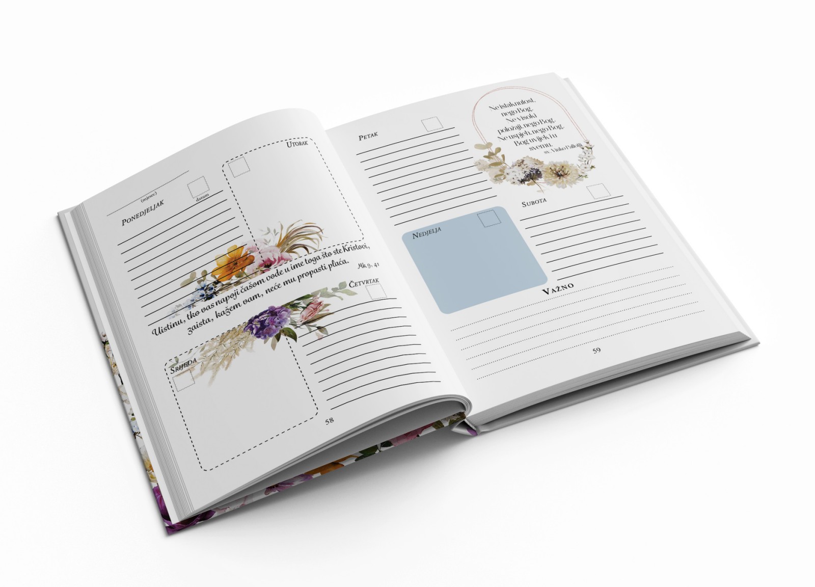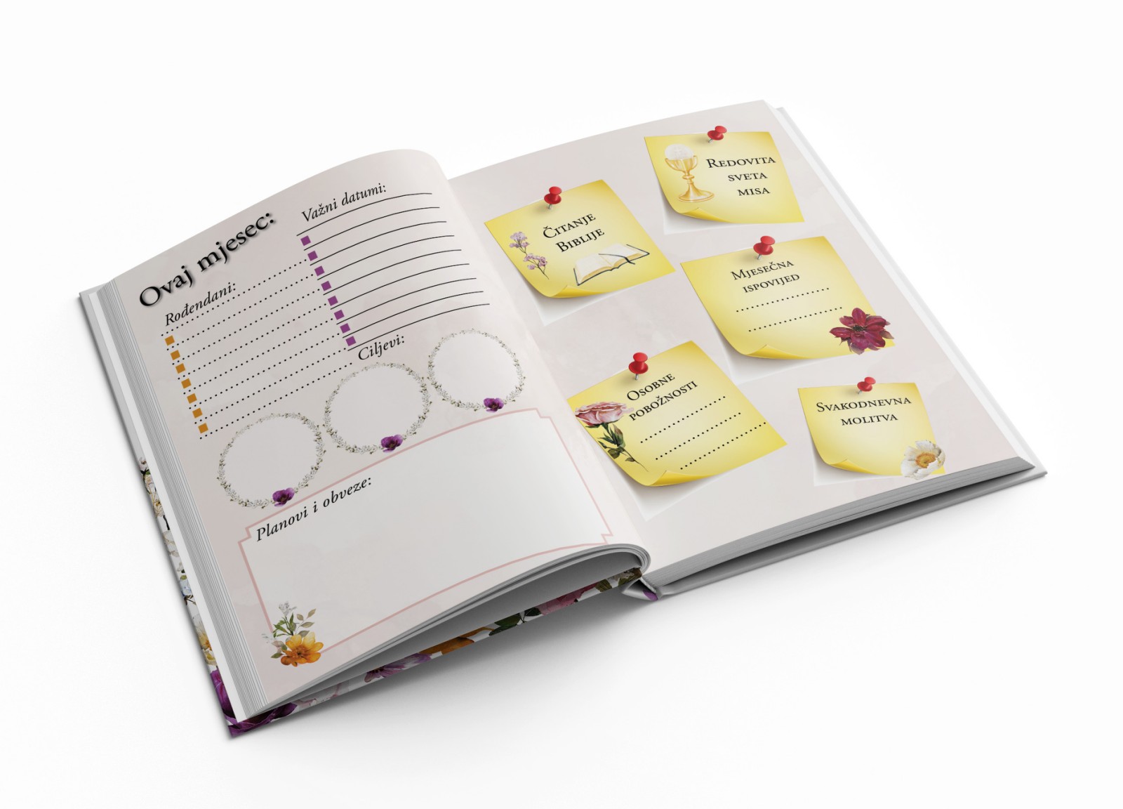 Na 224 stranice u boji, formata A5, tvrdih korica – pronaći ćete obilje duhovne motivacije budući da planer sadrži preko 70 biblijskih citata, preko 70 misli svetaca, podsjetnike za redovitu ispovijed, svetu misu, osobne pobožnosti, čitanje Biblije sve u svrhu njegovanja osobnog duhovnog rasta.