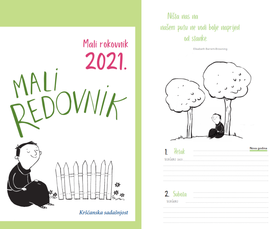 Ova topla knjiga prepuna humora koja pričama, mnogim praktičnim vježbama i poticajima na razmišljanje zasigurno će donijeti mir u život čitatelja, a možda i ponukati na tišinu koja može biti itekako plodonosna. Knjigu nadopunjava Mali rokovnik za 2021. s prigodnim citatom na početku svakog pojedinog mjeseca te s popisom liturgijskih svetkovina i blagdana, spomendana hrvatskih svetaca i blaženika te državnim praznicima i neradnim danima u Republici Hrvatskoj.