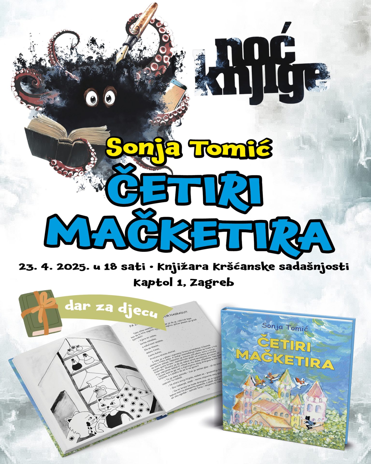 NOVOST IZ KRŠĆANSKE SADAŠNJOST Predstavljanje knjige Sonje Tomić ‘Četiri mačketira’ uz Noć knjige Kršćanska sadašnjost uz ovogodišnju Noć knjige 23. 4. u 18 sati u knjižari na zagrebačkom Kaptolu 1 organizira razgovor sa spisateljicom za djecu i mlade Sonjom Tomić, autoricom zabavne i poučne knjige Četiri mačketira koja promiče moralne, etičke i duhovne vrednote. Bitno.net Podijeli: Foto: KS U skladu s temom ovogodišnje Noći knjige – O životinjama i ljudima – događanje će aktualizirati važne životne teme na djeci pristupačan način, kroz alegoriju likova, u ovom slučaju šaljivih i snalažljivih – mačaka. Ulaz je slobodan za sve posjetitelje, napose djecu koju očekuju i prigodni darovi. O knjizi Četiri mačketira Četiri mačketira zabavna je pripovijest poznate hrvatske književnice kršćanskog određenja, Sonje Tomić koja najmlađe uvodi u svijet etike i duhovnih vrjednota. Djelo je na 206 stranica svjetlo dana ugledalo u veljači 2022. u izdanju Kršćanske sadašnjosti. Knjigu je ilustrirala sama autorica. Namijenjeno je djeci od osam do 12 godina, a vodi ih u mačji svijet kroz toplu priču pokazujući im vrijednosti prijateljstva i ljubavi. Ova zabavna pripovijest smještena je u mačji svijet i po zanimljivom zapletu i raspletu četvorice mačaka i prijatelja, „mačketira“, promiče moralne, etičke i duhovne vrjednote. Ova maštovita, topla, zabavna, ali i aktualizirana priča (mačketiri, primjerice, gledaju „Mačorchef“, emisiju o kuhanju; ubačene su neke aluzije na društvene stvarnosti kao što je recesija), djeci na pristupačan način objašnjava kršćanske i ljudske stvarnosti poput prijateljstva, svađe i pomirenja, i odgovara na pitanja kao što su: uslišava li Stvoritelj molitve, što je istinska ljubav, kako nadvladati strah te što je najvažnije u životu. Sonja Tomić priznata je naša spisateljica koja piše priče, hagiografije i romane za djecu, zatim članke, pjesme, putopise. Članica je Društva hrvatskih književnika. Osim pisanjem bavi se slikanjem i ilustriranjem te djeluje kao samostalna umjetnica. Foto: KS Podijeli: