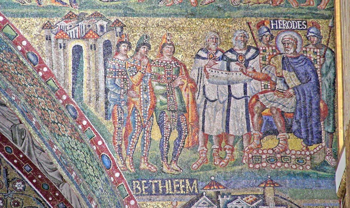 Treći prizor predstavlja pokolj nevine dječice koji je ovdje prikazan po prvi puta, i mudrace pred kraljem Herodom: on se pojavljuje kao protagonist u obje scene postajući slikom nelegitimnog kralja koji se, zaslijepljen ovozemaljskom moći, zatvara milosti. Međutim, čak je i Herod, piše Lav Veliki, „ne znajući promicao ovaj božji plan. Zbilo se zapravo da se, dok je on čitav obuzet zvjerskim zločinom progonio njemu nepoznato dijete općim pokoljem djece, glas koji je nebo navijestilo o rođenju Vladara pronosio sve jače, a širenje mu je olakšalo i učinilo ga istančanijim, kako novost nebeskog znaka, tako i okrutnost krvoločnog progonitelja.“ (Propovijed 13,1.3, druga o Bogojavljenju). Ta barbarski ubijena djeca smatraju se prvim mučenicima crkve. Komentirajući evanđeoski ulomak, Lav Veliki je rekao: „On je, naime, kako bi pokazao kakva slava je pripremljena onima koji ga nasljeduju, posvetio mučeništvom djecu rođenu u danima njegova rođenja; kako bi, rođeni kao Krist u Betlehemu, povezani s Njime istom dobi, postali dionici njegove muke.“ (Propovijed 18, 4.4).