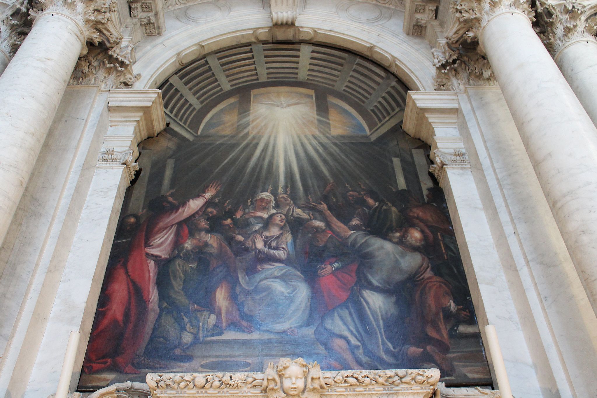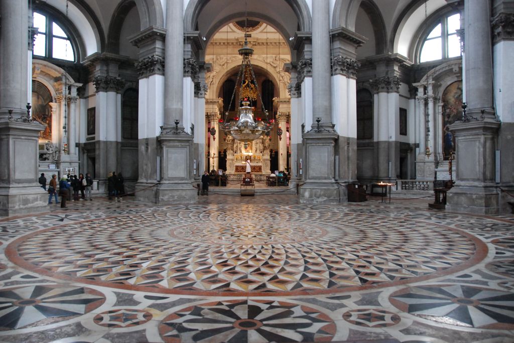 U bazilici Gospe od Zdravlja nalazi se podni natpis UNDE ORIGO INDE SALUS. Natpis polazi od toga da je utemeljenje Venecije bilo na Blagovijest 421., a po Mariji je došao i spas od kuge.