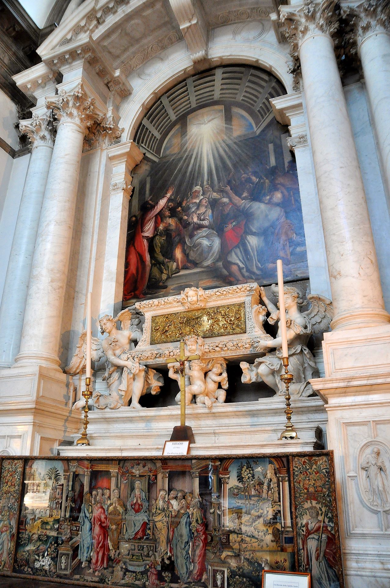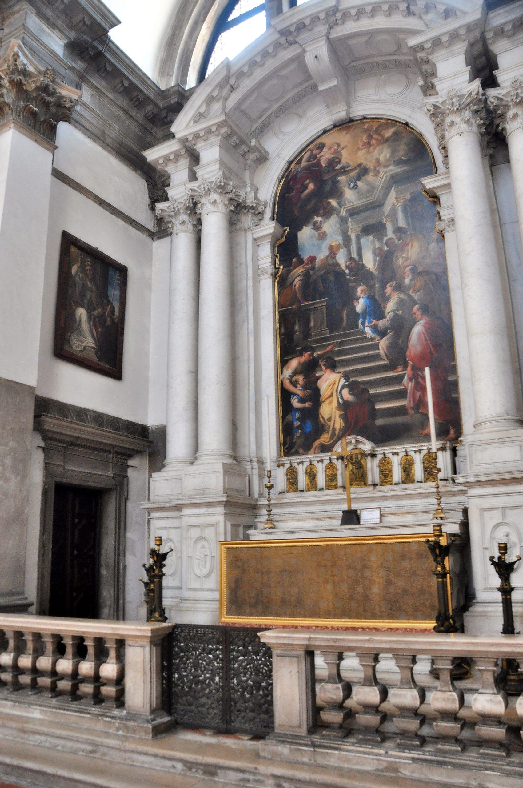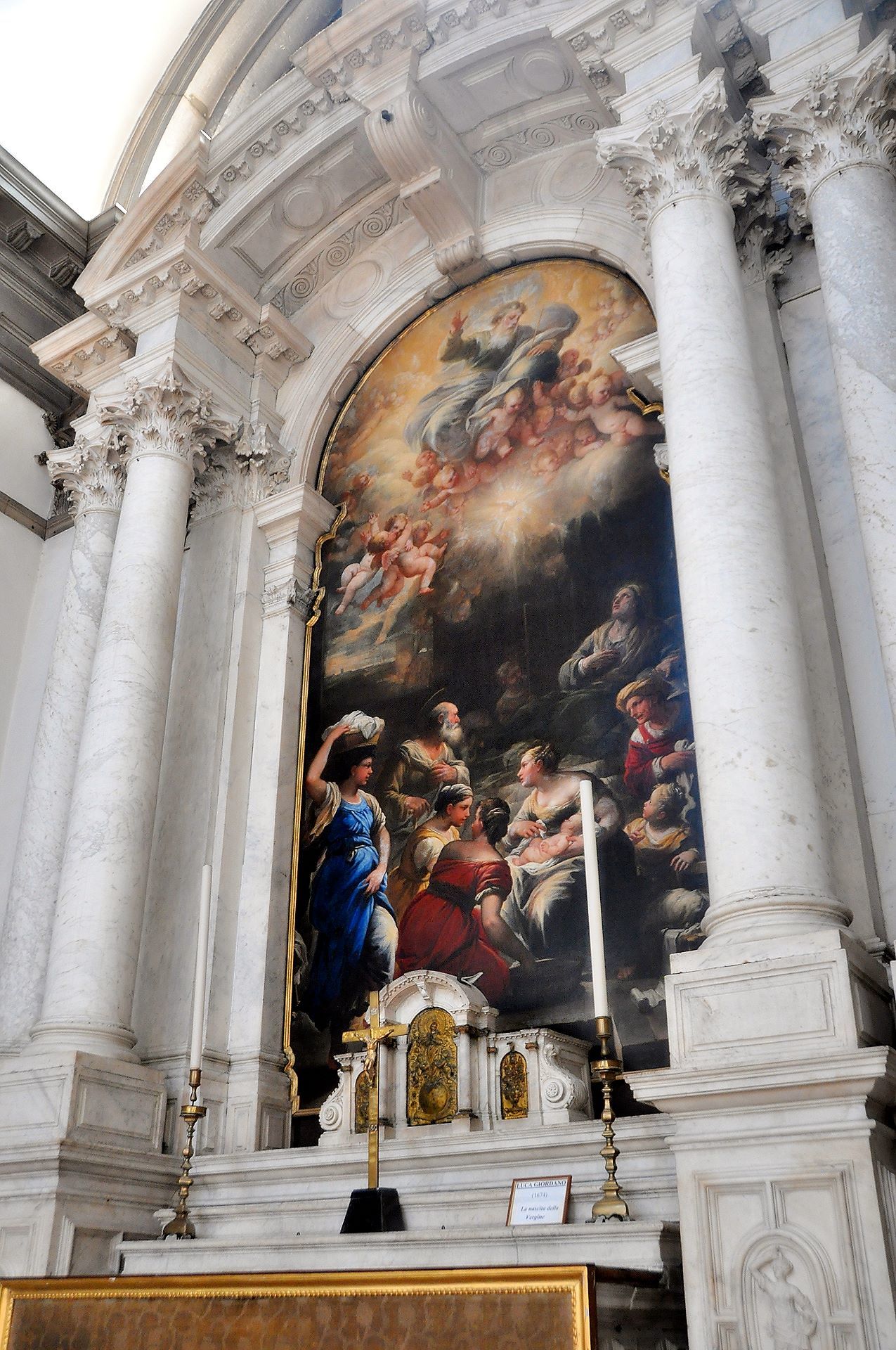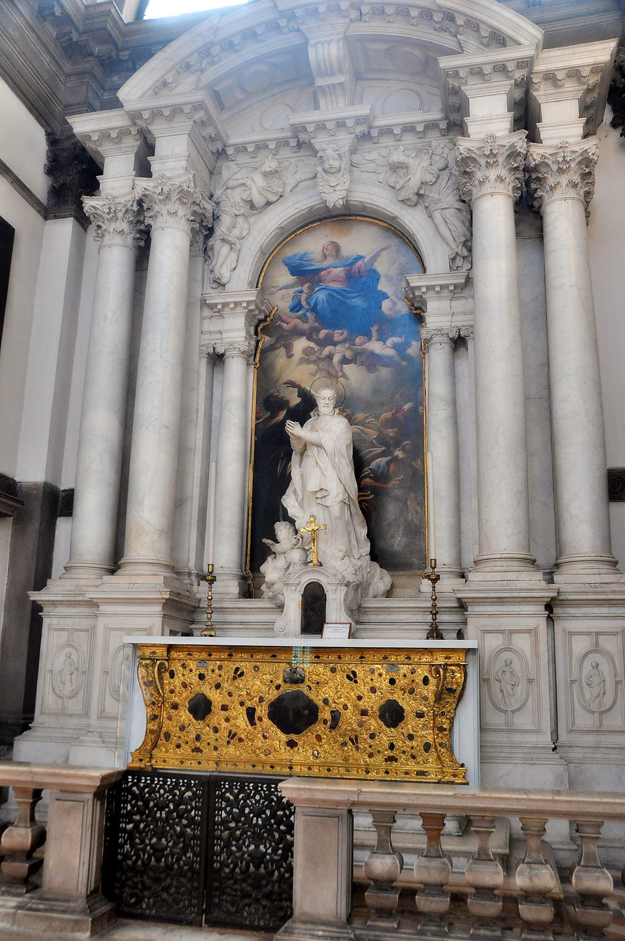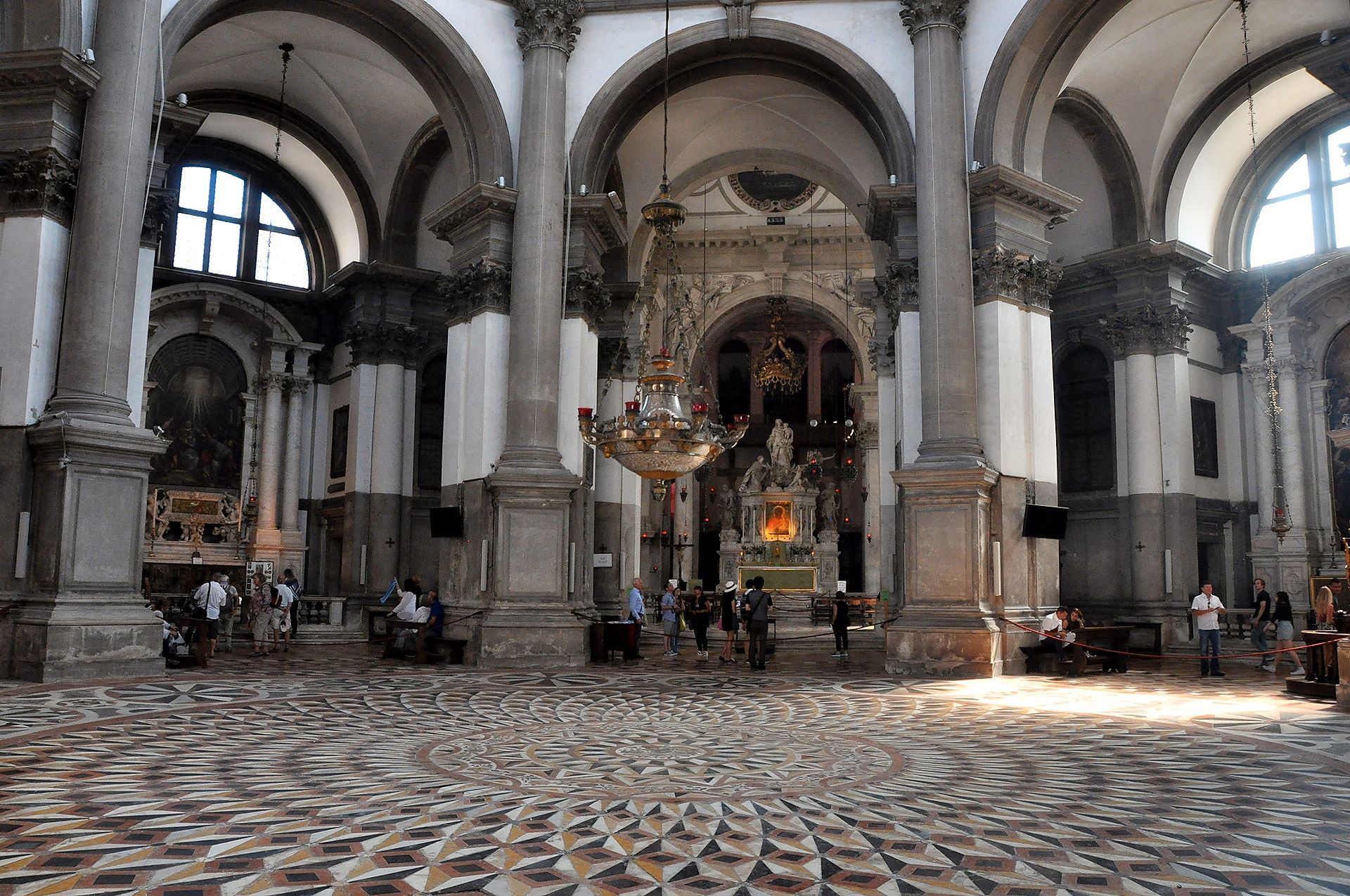 Crkva je blagoslovljena i otvorena za bogoslužje 1653. g., a svečano je posvećena 21. studenoga 1687. g. Do ulaza u baziliku vodi 15 stuba, što označavaju 15 otajstava krunice, a cijela crkva je prožeta marijanskom simbolikom. Nad središnjim dijelom glavnog oltara kip je Gospe s Djetetom, dok su uz nju kipovi-alegorije Venecije i kuge koju izgoni anđeo s bakljom. Sa strane su kipovi sv. Marka Evanđeliste i sv. Lovre Justinijanija, dvojice zaštitnika Venecije. Na oltaru je 1670. g. postavljena Gospina ikona pod nazivom Posrednica mira koja je u Veneciju donesena kad su Turci osvojili Kretu.
