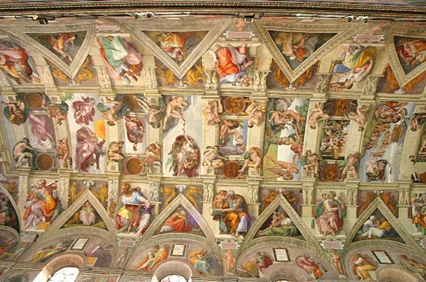 U četiri godine Michelangelo je oslikao 111,5 metara kvadratnih stropa pričama o Postanku koje su predstavljale savršen ikonografski dodatak radovima podno njih. Kada ih je otkrio, 31. listopada 1512., njegovi suvremenici bili su zapanjeni i oduševljeni njegovim postignućem i mogućnošću „čitanja“ priče s 20,7 metara.