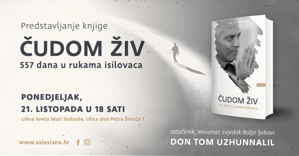 SALEZIJANAC U ZAROBLJENIŠTVU ISIL-A Danas u crkvi Sveta Mati Slobode don Tom predstavlja svoju knjigu ‘Čudom živ: 557 dana’ Predstavljanje knjige održat će se u ponedjeljak, 21. listopada u Zagrebu u 18 sati u crkvi Svete Mati Slobode na Jarunu Knjiga Čudom živ: 557 dana u rukama isilovaca autora don Toma Uzhunnalila svjedočanstvo je maloga čovjeka koji je iskusio veliku Božju milost. Priča koja donosi potpuno drugačiju stvarnost od naše uobičajene svakodnevice. Iskustvo koje će svakoga obogatiti vjerom u živoga Boga i zahvalnošću za darovani život. Predstavljanje knjige održat će se u ponedjeljak, 21. listopada u Zagrebu u 18 sati crkvi Svete Mati Slobode na Jarunu. Voditelj programa je Marin Periš, a o knjizi će govoriti vlč. Odilon Singbo, urednica Nada Babić i autor – don Tom Uzhunnalil. Nakon predstavljanja knjige, u 20 sati slijedi molitveni susret s braniteljima na koji ste također svi dobrodošli! Knjigu ćete moći kupiti po promotivnoj cijeni od 60 kuna, a već ju sada možete naručiti u Salesianinoj online trgovini. Budući da se posjet poklapa s izvanrednim misijskim mjesecom i misijskom nedjeljom, Salezijanska provincija priredila je notes “Spomeni se” (i notes i naslov imaju „izvor“ u don Tomovoj knjizi), a prihod je namijenjen misionarima u Indiji. Bitno.net Podijeli: