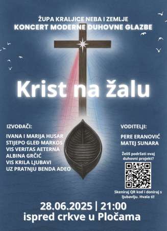 28. LIPNJA U Pločama se i ovoga ljeta organizira koncert moderne duhovne glazbe ‘Krist na žalu’ Tradicionalni koncert moderne duhovne glazbe "Krist na žalu" održat će se i ove godine 28. lipnja 2025. u subotu u 21 sat ispred crkve u Pločama u organizaciji Župe Kraljice Neba i Zemlje Bitno.net Podijeli: Na koncertu će nastupati Ivana i Marija Husar, Stijepo Gleđ Markos, Vis Veritas aeterna, Albina Grčić i domaćini Vis Krila ljubavi uz pratnju benda Adeo. Voditelj koncerta je Matej Sunara. Koncert se financira donacijama pa organizatori potiču one koji su u mogućnosti da ih podrže, skeniraju QR kod i uplati na račun Vis-a Krila ljubavi. “Svaka donacija puno vrijedi i unaprijed se zahvaljujemo svima”, poručuju. Podijeli: