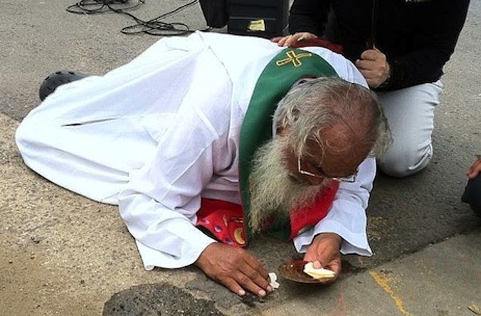 HRABRI SVEĆENIK Fotografija koja pokazuje što znači biti svećenik: Policija ga bacila na pod, a on štiti hostiju koja je na zemlji