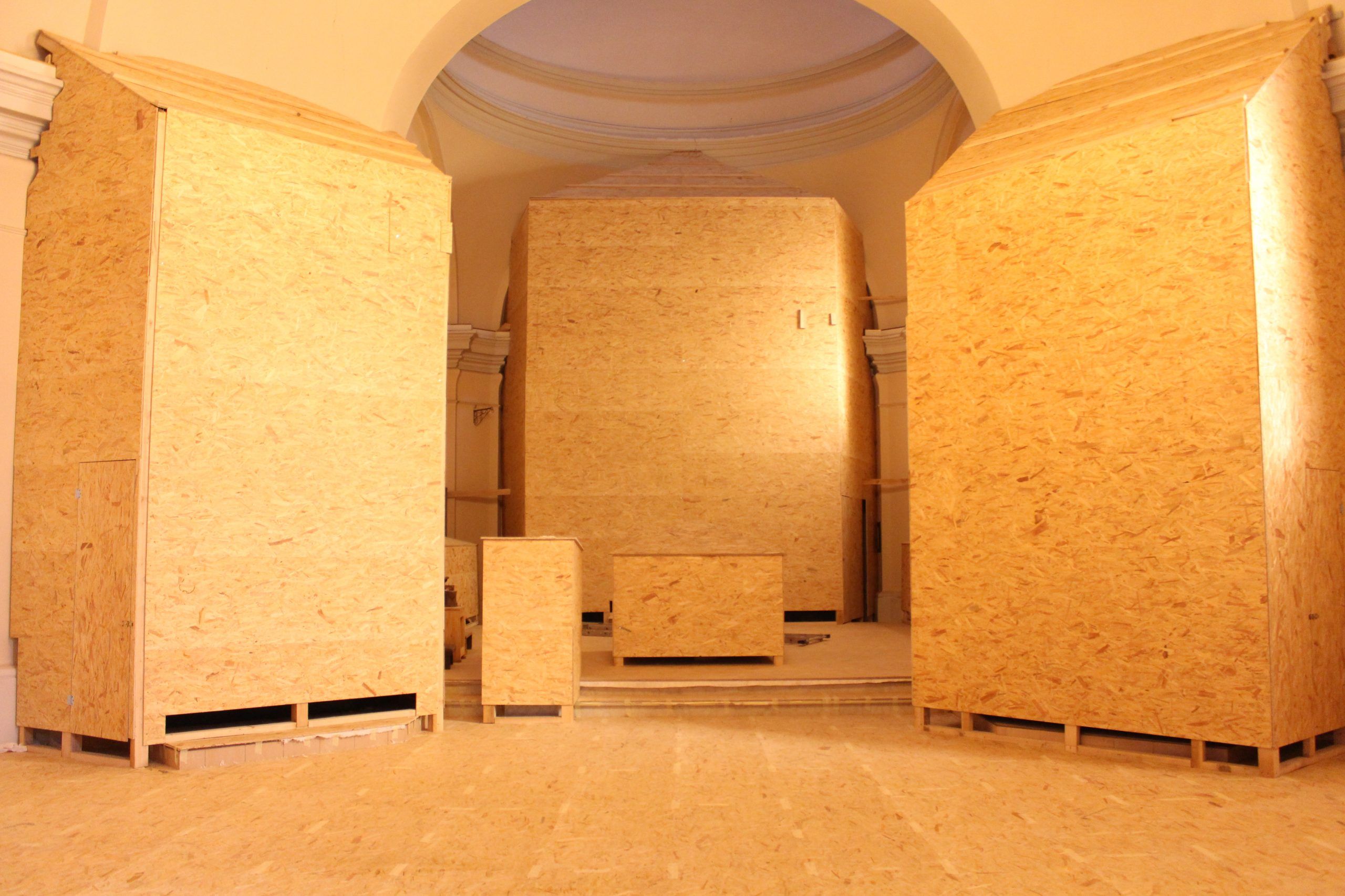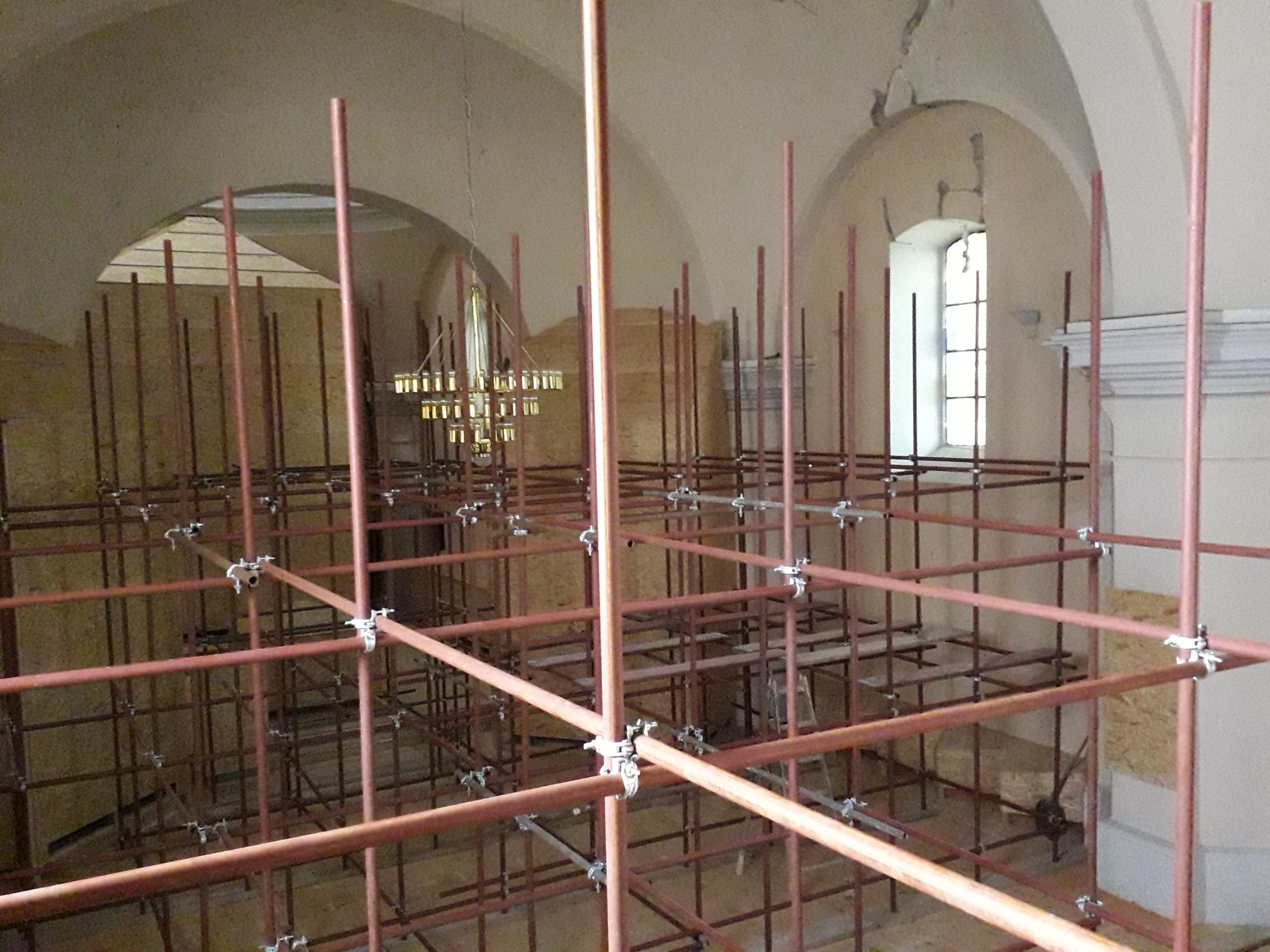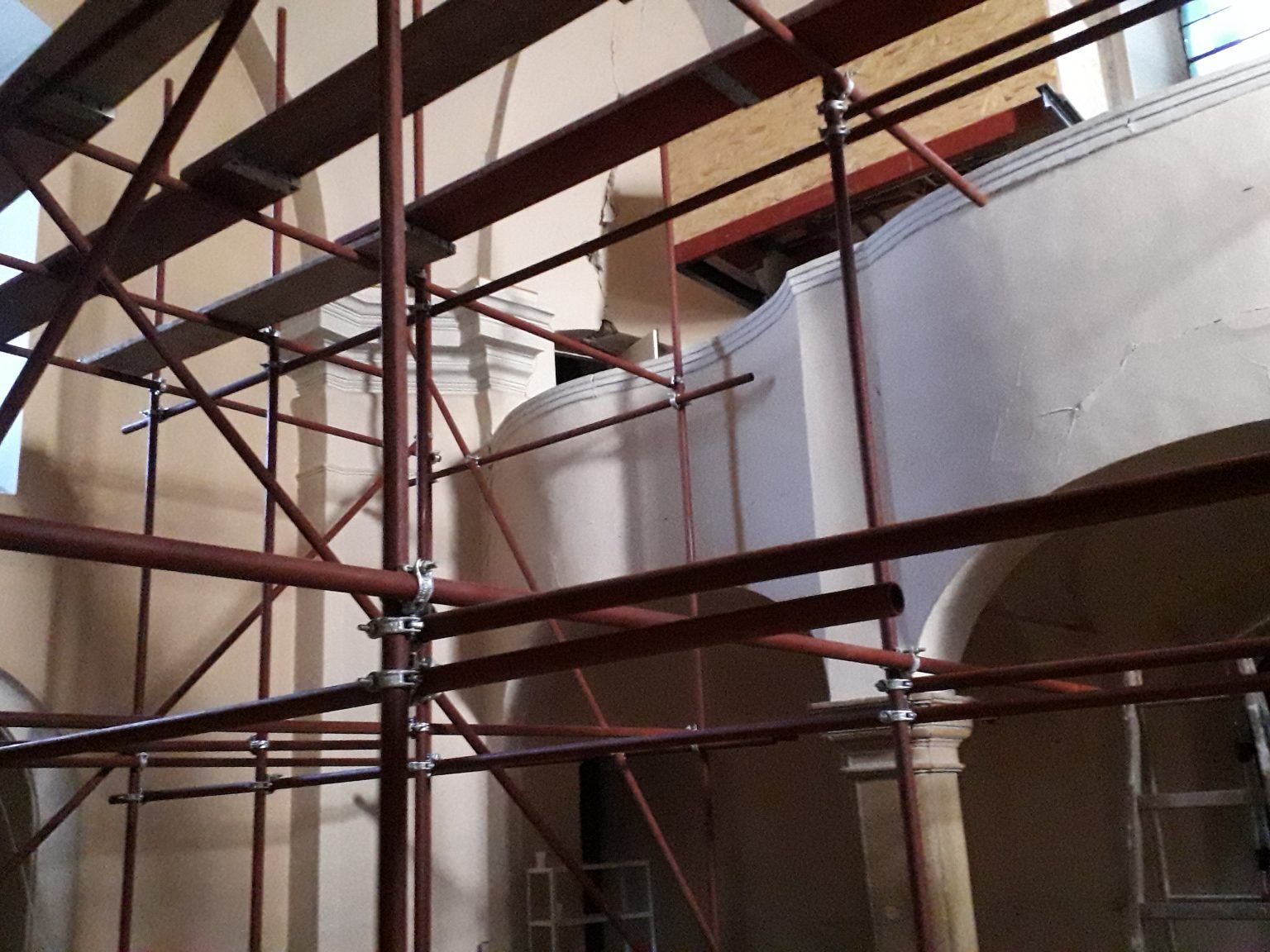 Crkvene klupe iznesene su još poslije Uskrsa. Također, demontirane su i u poseban prostor smještene velike orgulje koje su se nalazile na zidu glavnoga pročelja koji se zbog potresa počeo odvajati od uzdužnih zidova crkve. Demontirani su i ispovjedaonica, unutrašnja ulazna vrata i veliki središnji luster. Tako je prostor crkvene lađe pripremljen za postavljanje skelâ.