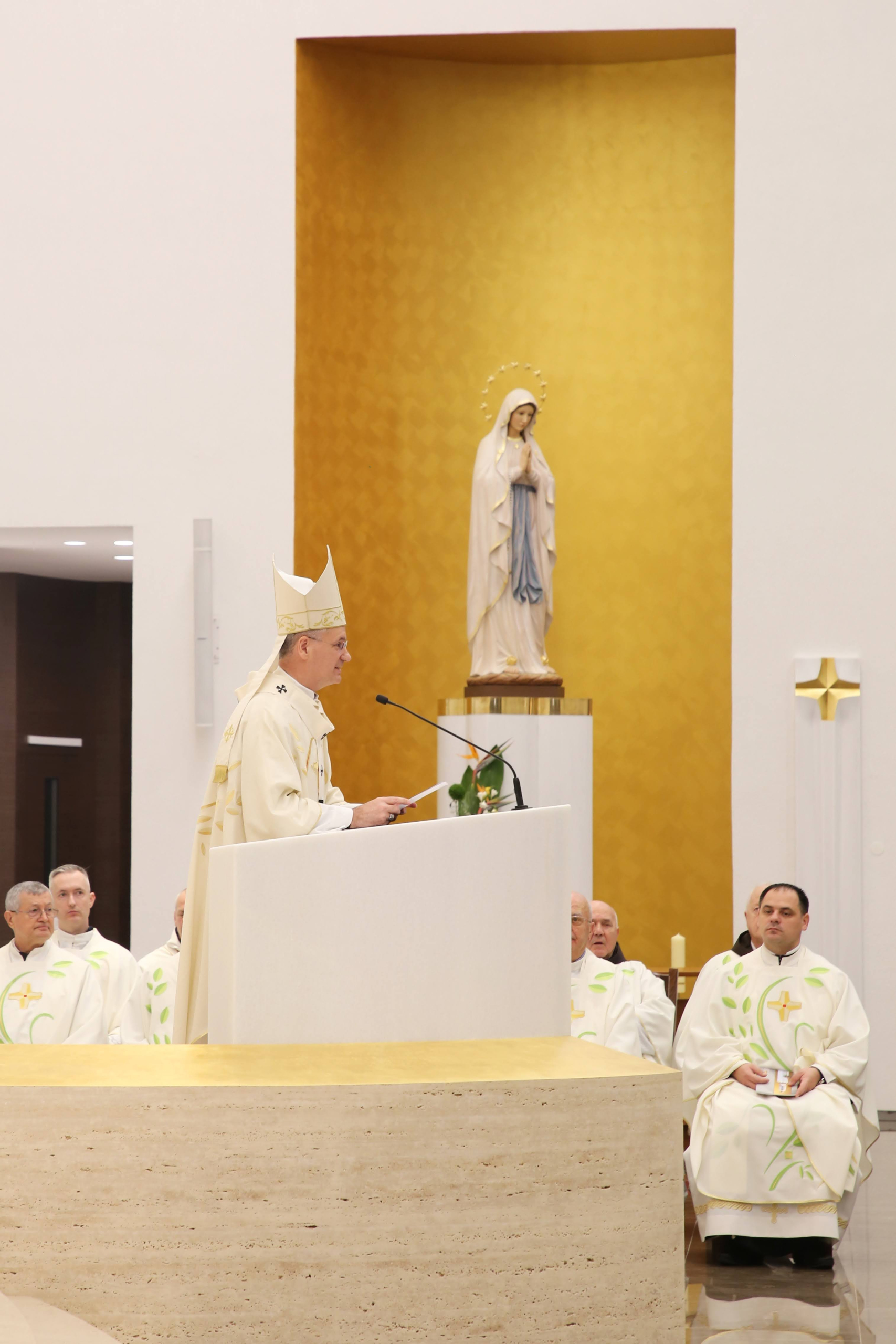 U homiliji nadbiskup je kazao kako je to poseban dan za vjernike te župe, franjevačku zajednicu koja skrbi za njihove duhovne potrebe, za grad Zagreb, ali i cijelu Domovinu zbog pobožnosti koju hrvatski narod iskazuje Majci Božjoj. „Danas ovdje imamo živu Crkvu, zajednicu vjernika koja živi i daje plodove pobožnosti i svetosti. Posveta ovog bogoslužnog prostora izvanjska je kruna i pokazatelj onoga što Crkva u svojoj biti jest”, dodao je.
