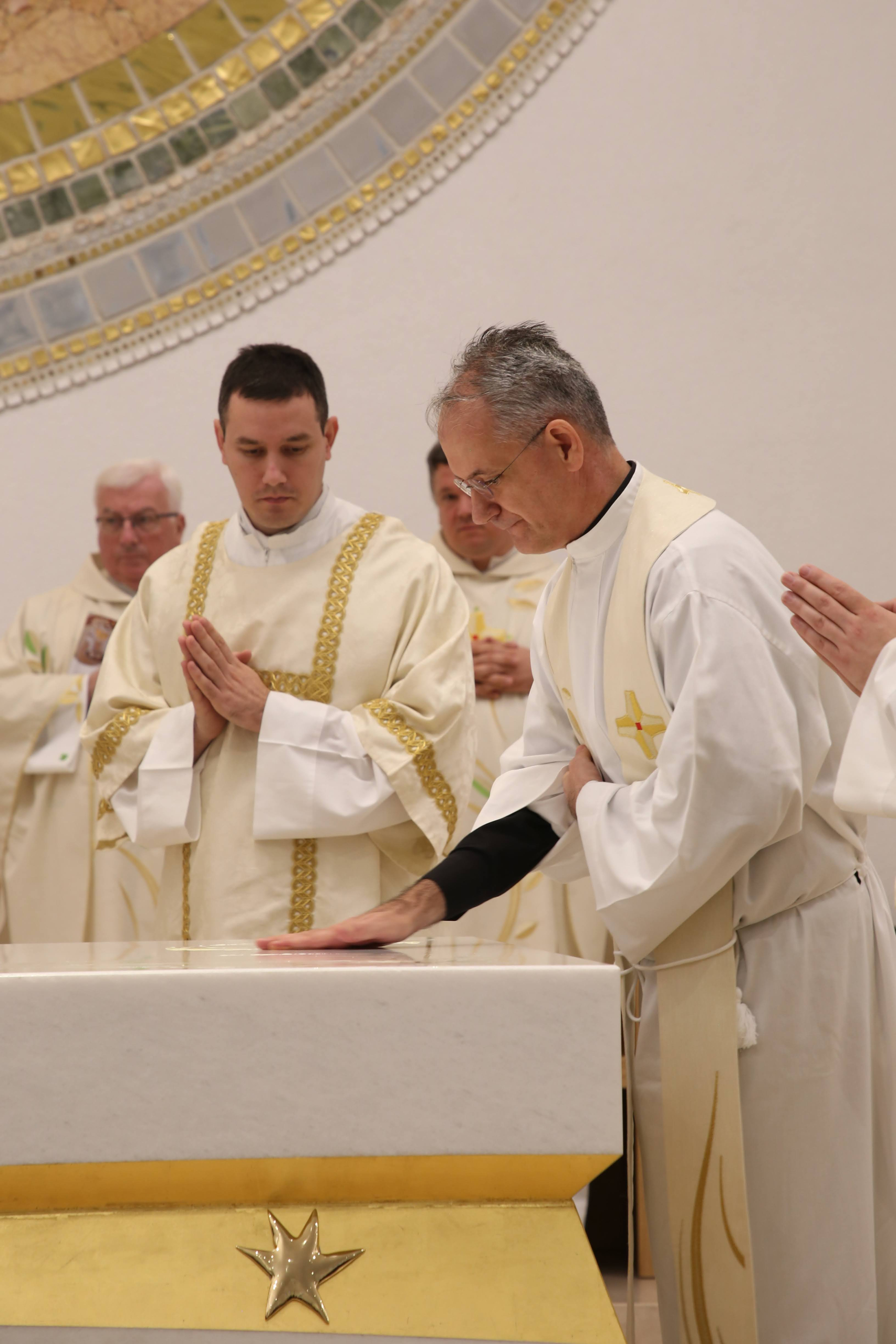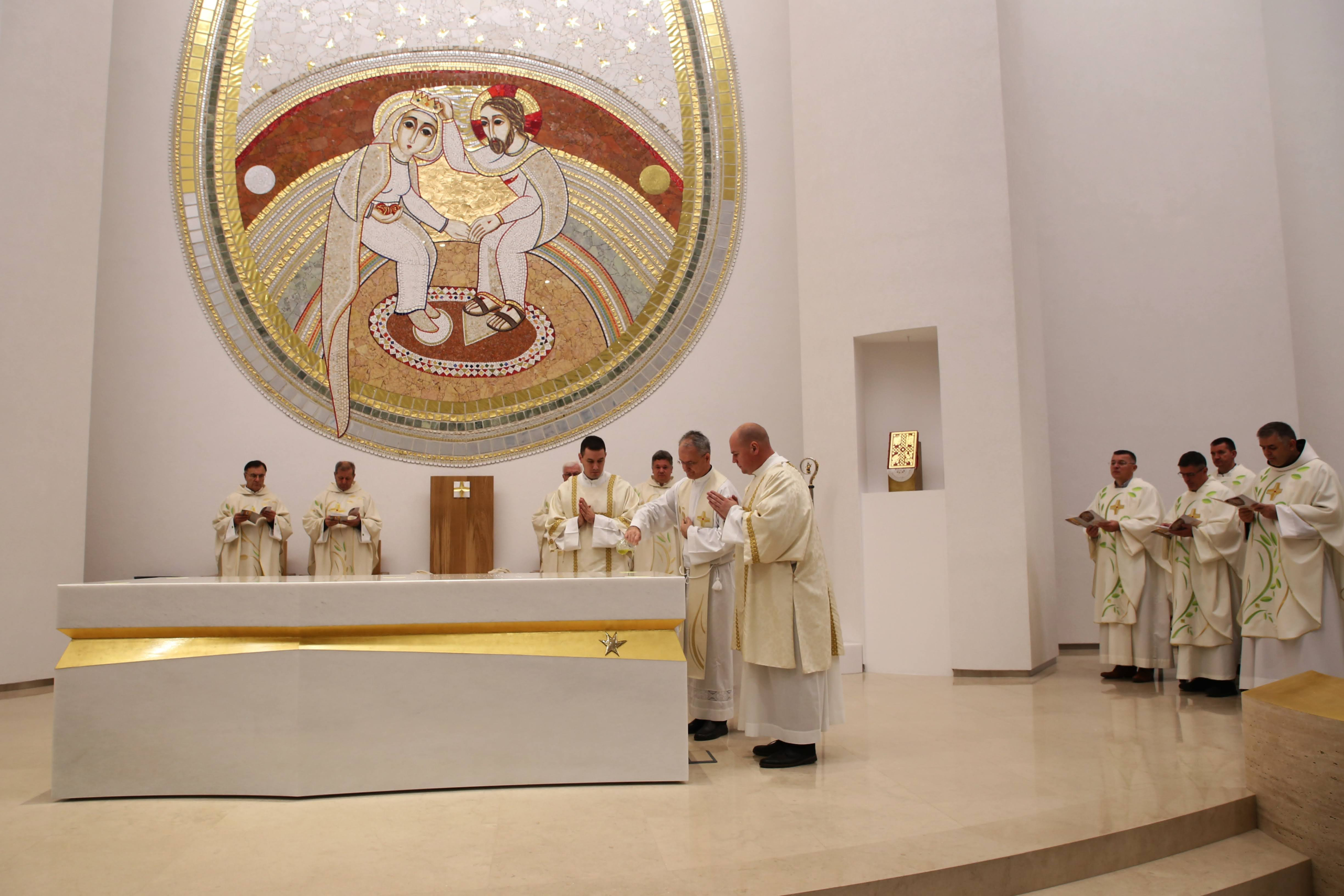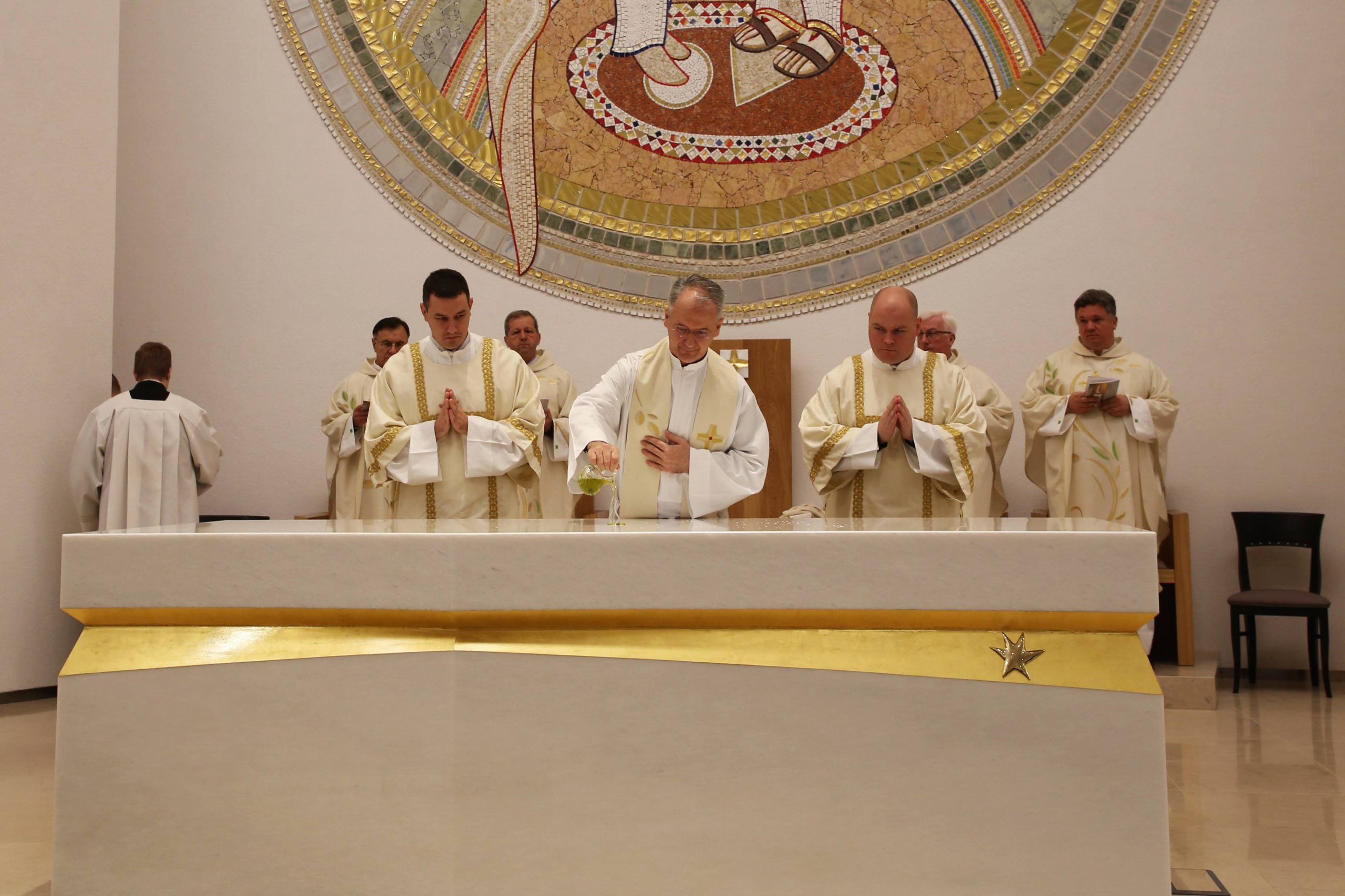 Uslijedila je posvetna molitva, nakon koje je nadbiskup izlio krizmu i pomazao oltar, a provincijal fra Marko Mrše i dekan preč. Josip Golubić pomazali su posvetne križeve na stijenama crkve.