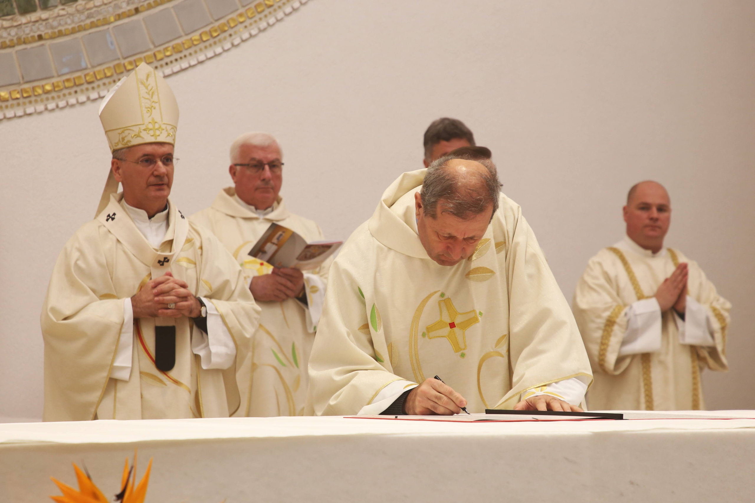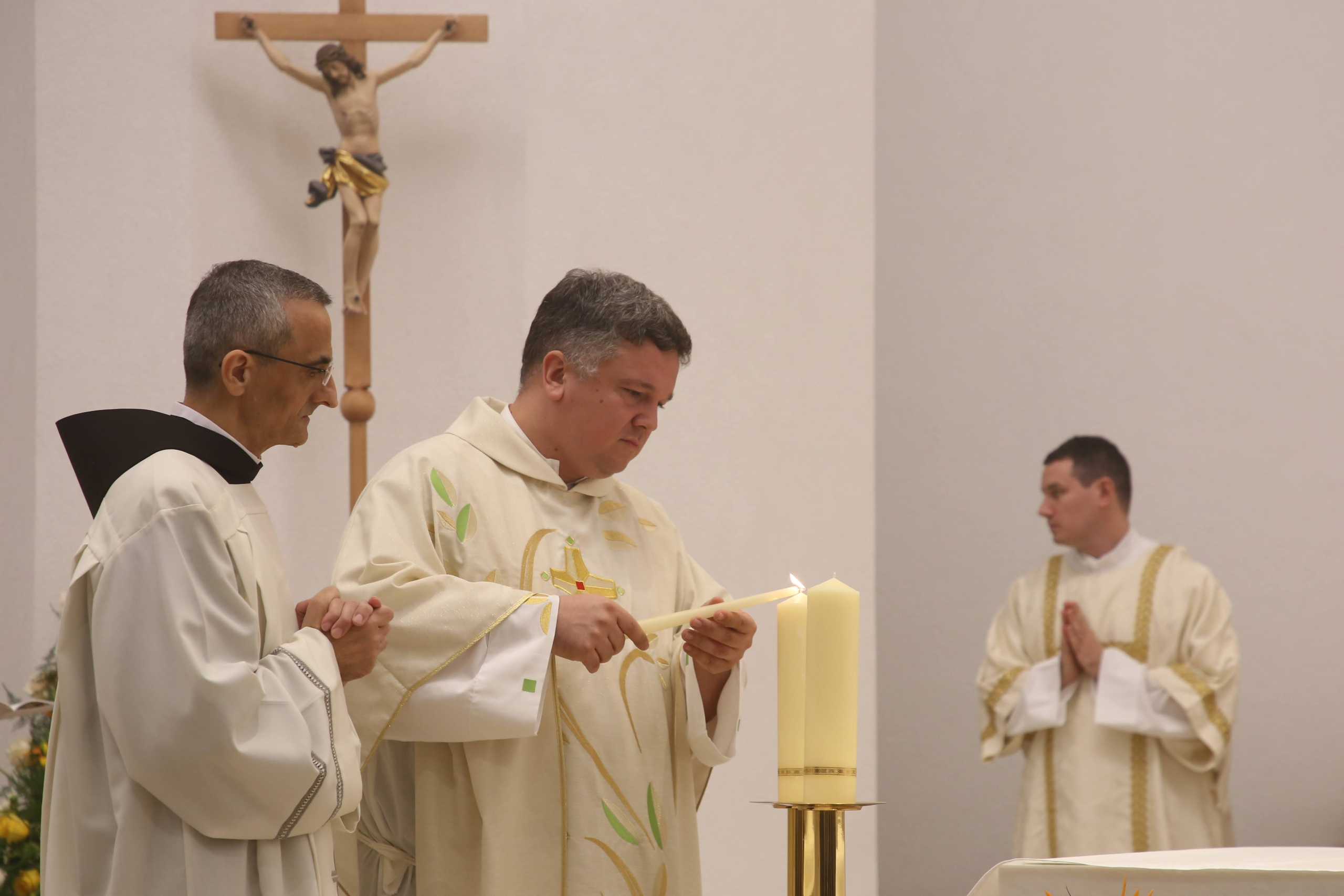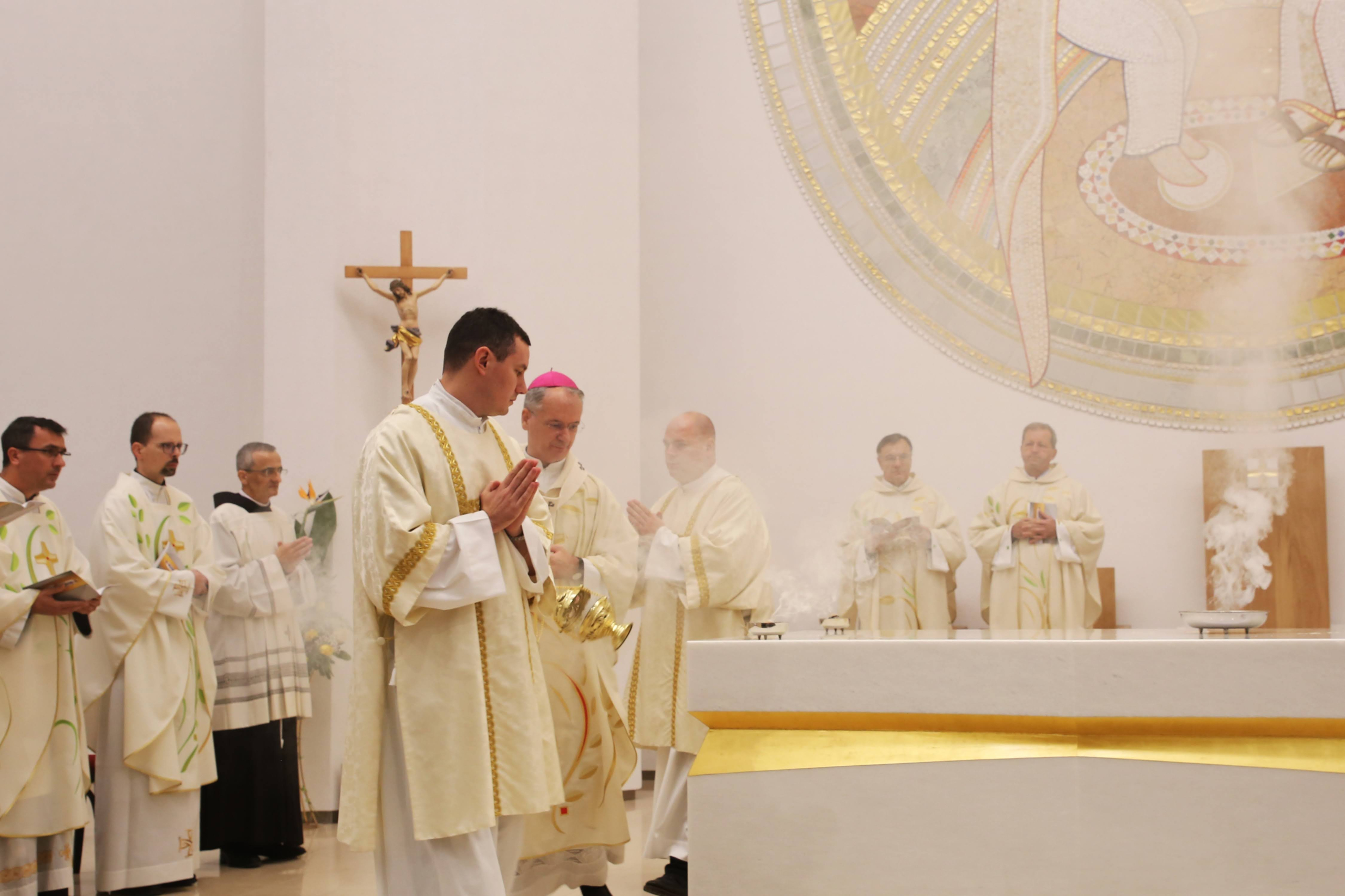 Uslijedila je posvetna molitva, nakon koje je nadbiskup izlio krizmu i pomazao oltar, a provincijal fra Marko Mrše i dekan preč. Josip Golubić pomazali su posvetne križeve na stijenama crkve.