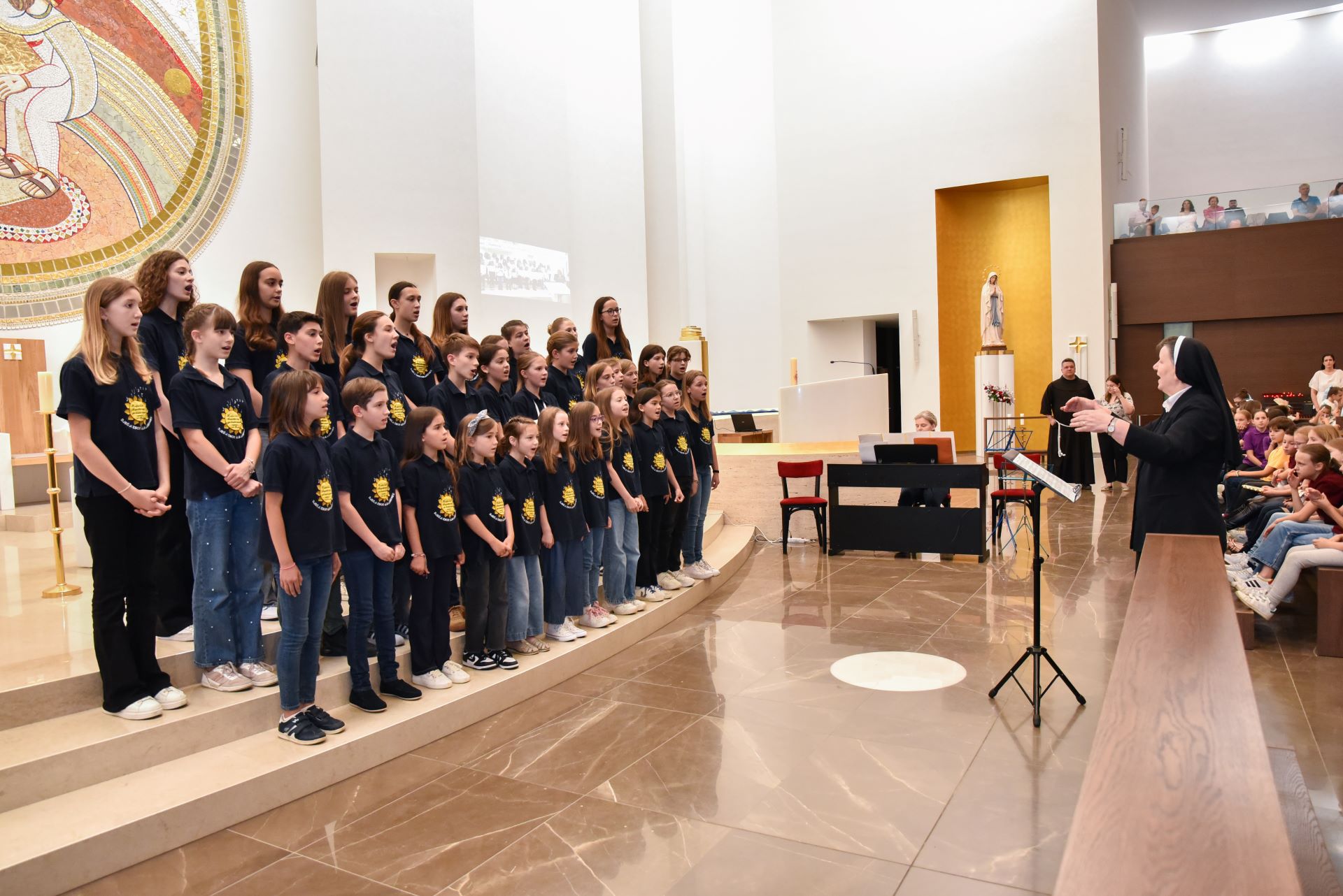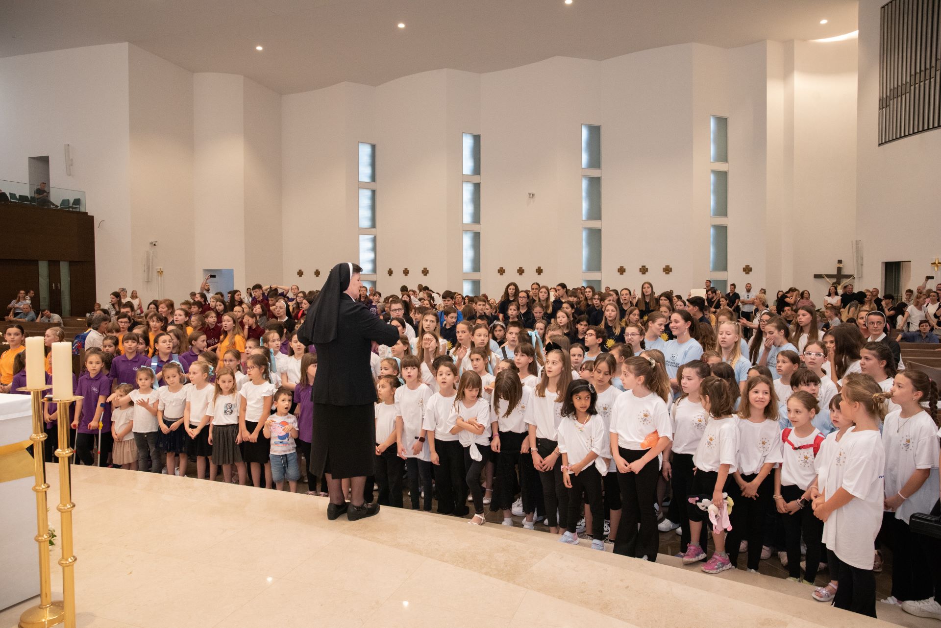 Crkva je bila ispunjena do posljednjeg mjesta, u prvom redu članovima zborova, a potom njihovim voditeljima i članovima obitelji. Svi su sudjelovali u slavlju svete mise koju je predvodio župnik fra Ante Bešlić, uz koncelebraciju gvardijana fra Bože Vulete i župnika crkve Uznesenja Blažene Djevice Marije don Vjekoslava Meštrića. Djeca su pratila liturgiju veličajući svojim glasovima Gospodina gromkim i skladnim pjevanjem tijekom mise, a sve je vodila, animirala i dirigirala pokrajinska zastupnica za grad Zagreb, a ujedno i voditeljica dječjeg zbora „Sunce“, s. Željka Čeko.