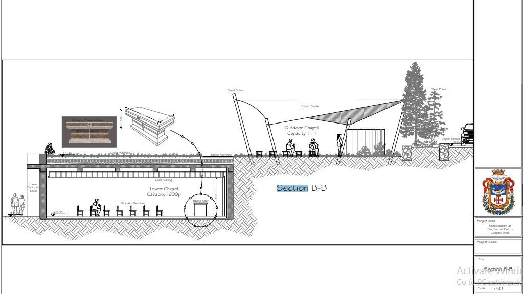 Kapela hrvatskih svetaca i mučenika trebala bi se sastojati od dva bogoslužna prostora: kapele na otvorenom kapaciteta 111 sjedećih mjesta te zatvorenog prostora kapaciteta 200 sjedećih mjesta. Obje kapele imat će svoj oltar.