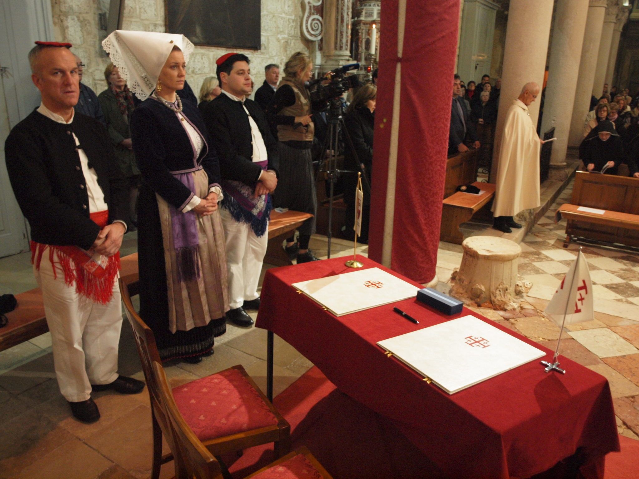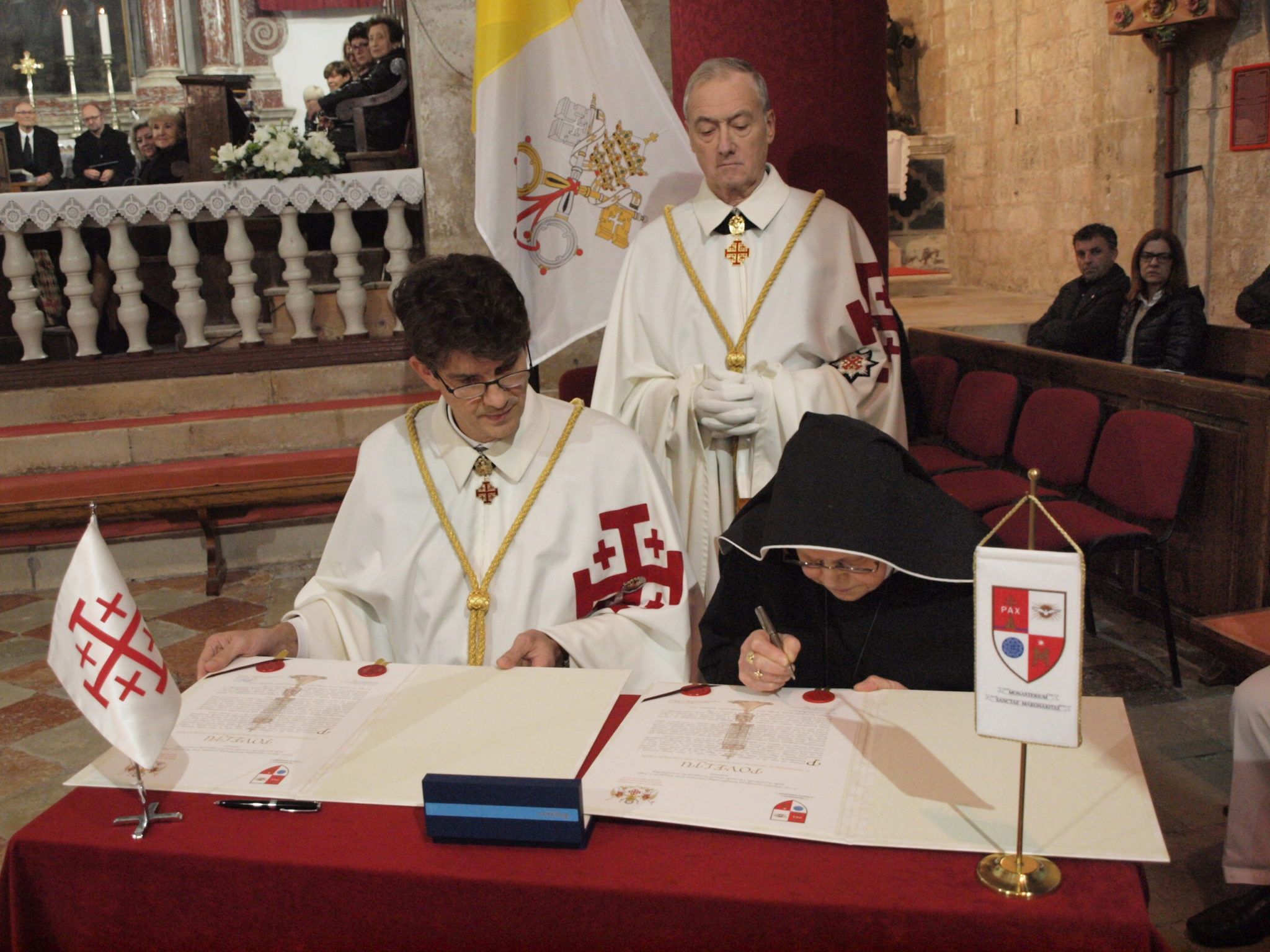 Misno slavlje predvodio je mons. Josip Lenkić, generalni vikar Zadarske nadbiskupije kao delegat zadarskog nadbiskupa Želimira Puljića. Povelju o suradnji na kraju mise potpisali su s. Bernardica Badurina, opatica paškog benediktinskog samostana sv. Margarite, i Claude Grbeša, magistralni delegat Viteškog reda Svetoga groba jeruzalemskoga za Hrvatsku, o 700. obljetnici utemeljenja ženskog benediktinskog samostana sv. Margarite u Pagu. Za stolom na desno od glavnog oltara u prezbiteriju paške zborne crkve, pokraj stijega vatikanske zastave, potpisnici su za vrijeme potpisivanja dva primjerka Povelje, za paški samostan i hrvatsku Magistralnu delegaciju, bili u pratnji generala Jeana Marie Fugerea, namjesnika Viteškog reda Svetoga groba jeruzalemskoga za Francusku.