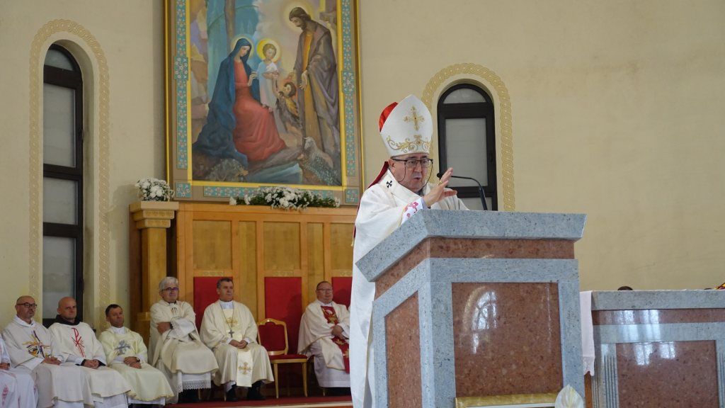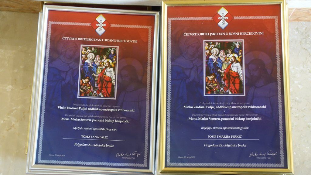 FOTOGALERIJA S 4. OBITELJSKOG DANA U BiH Kupres: Pred kardinalom Puljićem i ispunjenom crkvom više od trideset bračnih parova proslavilo srebrni i zlatni pir U nedjelju, 25. srpnja 2021. u prepunoj župnoj crkvi Svete obitelji u Kupresu svečano je proslavljen 4. Obiteljski dan u BiH pod geslom „Obitelj – svjedočanstvo radosne ljubavi“. Ujedno je proslavljen i 1. Svjetski dan djedova i baka i starijih osoba koji se, na poziv pape Franje, obilježava širom svijeta pa tako i u svim župnim i drugim zajednicama u Bosni i Hercegovini. KTA Podijeli: Foto: KTA BiH Euharistijsko slavlje predvodio je predsjednik Biskupske konferencije Bosne i Hercegovine kardinal Vinko Puljić, nadbiskup metropolit vrhbosanski, u zajedništvu s nadbiskupom koadjutorom vrhbosanskim i apostolskim upraviteljem Vojnog ordinarijata BiH mons. Tome Vukšića i predsjednika Vijeća za obitelj BK BiH mons. Marka Semrena, pomoćnog biskupa banjolučkog. Tijekom Svete mise kardinal Puljić je krstio malog Jakova podsjećajući da upravo u sjeni ove nedjelje Crkva slavi i blagdan sv. Jakova apostola. Na kraju Svete mise kardinal Puljić je podijelio i apostolske blagoslove za 35 bračnih parova koji su došli u kuprešku crkvu obilježiti 25 godina bračnog zajedništva i za jedan bračni par koji je proslavio svoj zlatni pir. Prije Svete mise kupreški župnik vlč. Tomislav Mlakić radosno je pozdravio s tromeđe – Tropolja Vrhbosanske, Banjolučke i Mostarsko-duvanjske biskupije sve okupljene u crkvi i sve one koji putem valova Radiotelevizije Herceg Bosne, Laudato televizije, Radija Kupresa, Radija Marije i drugih tv i radiopostaja te elektroničkih medija prate Euharistijsko slavlje. Osobito je pozdravio djedove, bake i starije osobe i zahvalio im „za svjedočanstvo vjere i vjernosti“. Zamolio je sve ostavljene i osamljene stare osobe, u ime mlađih i onih koji su u punoj snazi, za oproštenje zbog neuzvraćene ljubavi. Pozdravio je i svu braću svećenike, a na osobit način savjetnika Apostolske nuncijature u BiH mons. Amaurya Medinu Blanca, zatim mons. Željka Majića, delegata biskupa mostarsko-duvanjskog i apostolskog upravitelja trebinjsko-mrkanskog mons. Petra Palića, i generalnog tajnika BK BiH mons. Ivu Tomaševića. Poseban pozdrav je uputio biskupu Semrenu, nadbiskupu Vukšiću i kardinalu Puljiću. „Na koncu, u ime ovog okupljenog puka katoličkog, kupreškog i hrvatskog, pozdravljam vas dragi oče nadbiskupe, kardinale Vinko. Dok vam zahvaljujem što nas ne prestajete hrabriti u nastojanju da ova crkva na visoravni, providnošću smještena na raskrižju mnogih puteva, postane svetište u kojem će obitelji pronalaziti okrjepu i prositi blagoslov neba, molim vas da otpočnete ovo sveto Euharistijsko slavlje“, kazao je župnik Mlakić. Kardinal Puljić, uvodeći u Misno slavlje, pozdravio je sve okupljene, čestitao svim obiteljima dan obitelji kao i župi Kupres koja je posvećena Svetoj Obitelji te svima koji slave jubilej svoga braka. Zahvalio je medijskim djelatnicama te čestitao imendan svima koji nose ime po sv. Jakovu apostolu. Posebno je pozvao na molitvu za djedove i bake i starije osobe na njihov prvi svjetski dan. Pošto je trajni đakon Robert navijestio evanđeoski odlomak, kardinal Puljić je u prigodnoj propovijedi podsjetio na riječi sv. Ivana apostola da je Bog ljubav. „Znamo da se prava ljubav nikad ne zatvara u sebe nego se dariva. Trojedini Bog koji je ljubav htio je podijeliti božansku ljubav. Zato je stvorio čovjeka – muško i žensko i dao im zadatak da rađaju djecu. To je prva zapovijed u Svetom Pismu. Zašto? Zato što je Bog koji je ljubav stvorio ljude na svoju sliku i priliku. Plod te ljubavi jesu djeca koja se rađaju u suradnji roditelja s Bogom da donose život na ovaj svijet. Zato trebamo biti hrabri i ne dati se zavarati, zavesti i smutiti, ovim tobože u ime demokracije, stavovima koji su protiv tih Božjih zakona. Želimo na ovaj dan obitelji na poseban način vratiti u svijest dostojanstvo obitelji. Ona je Božji dar, Božja ustanova i mi je moramo vrjednovati“, poručio je vrhbosanski nadbiskup. Podsjećajući na evanđeoski odlomak u kojem je prikazano kako Isus čudesno hrani mnoštvo ljudi, kardinal Puljić je ukazao na potrebu hranjenja ljubavi koju je Bog utkao u čovjeka svojim stvaranjem. „Čuli ste u evanđelju kao Bog se brine i čovjeka hrani. Mi smo dužni shvatiti da sve što je od Boga naša obveza. Jedna je od obveza hraniti i tijelo i dušu. Isto tako ljubav se potroši ako se ne dariva i ne hrani. Vi dobro znate da uljanice prestane gorjeti ako nema ulja. Tako i životna ljubav – ako nema što izgarati, ona se ugasi. A izgara se darivanjem, žrtvovanjem, zauzimanjem. Zato mi želimo obilježiti jubilej 25 i 50 ljeta bračnog zajedništva. U prvom redu zahvaljujemo Bogu jer je to Božji dar. Božji je dar da mi s Bogom smijemo surađivati i u toj ljubavi donositi živote na ovaj svijet, ali i moliti da ta vatra ljubavi živi i izgara da nikad ne posustanemo u Božjoj ljubavi“, kazao je kardinal Puljić koji je potom osvrnuo i na mentalitet sebičnosti u ovom vremenu. „Svjesni ste kako je ušao mentalitet sebičnosti: neću se patiti s djecom, dosta mi je dvoje djece. I onda imamo sebično društvo. Čudimo se kada dođu na vlast pa sebično reagiraju. Ništa čudno jer su odgojeni za sebičnost. Koliko puta se zna reći: neću da se moje dijete pati ako sam se ja patio. Nema nikoga da je u životu uspio ako se nije napatio. Moramo se učiti žrtvi i spremnosti da jedni s drugima izgaramo za Božju stvar“, poručio je vrhbosanski nadbiskup. „Spominjući se dana djedova, baka i starih, moramo vratiti radost obiteljskog zajedništva. Pa i onda kada drugi trebaju brinuti, ali da djeca dožive djeda i baku i da posebno vodimo brigu o onima koji su osamljeni. A osamljeni da shvate da nisu sami i da je Bog s njima te da mogu svoje žrtve prikazivati za svoju za djecu, za mlade i za zvanja“, rekao je kardinal Puljić 