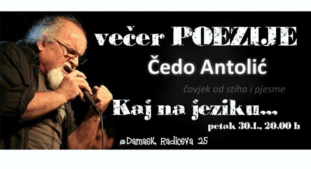KAJ NA JEZIKU Večer poezije na kajkavskom Čede Antolića u cafe baru ‘Damask’ Caffe bar Damask ovaj petak (30. siječnja) ugošćuje legendu duhovne glazbe Čedu Antolića u malo drugačijem izdanju. Umjesto klasične pjesme ili koncerta, Čedo će interpretirati svoju kajkavsku poeziju, od duhovnih pjesama do ljubavnih i onih životnih. Damask time započinje serijal umjetničkih večeri koje će se ubuduće održavati svakog četvrtka. Početak je u 20 sati, a ulaz je slobodan. Rezervirajte svoje mjesto na vrijeme! Podijeli: